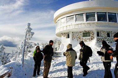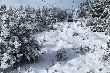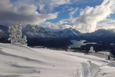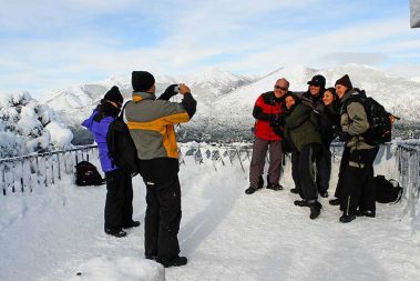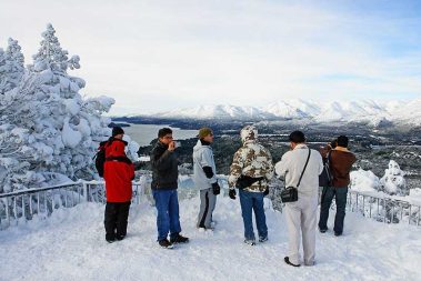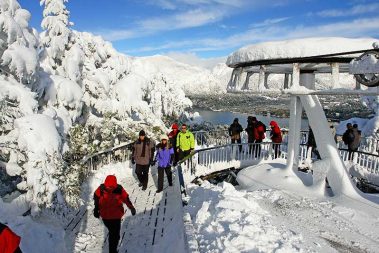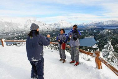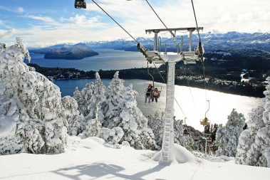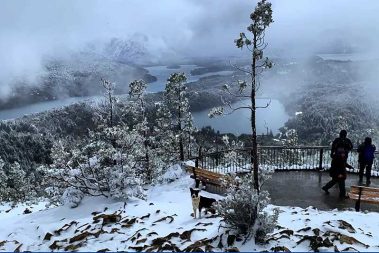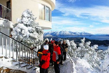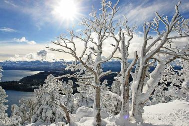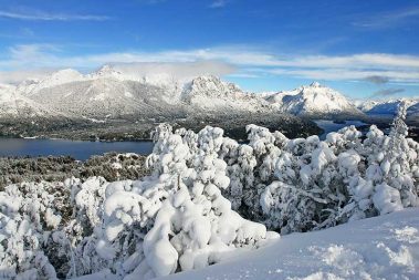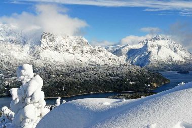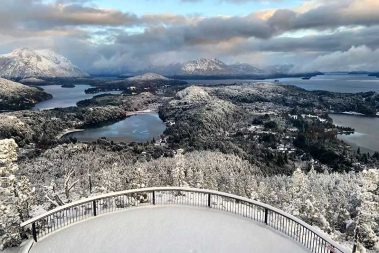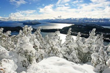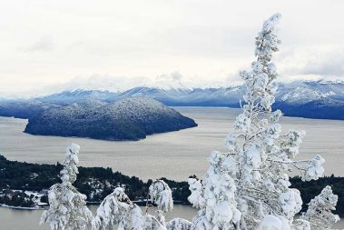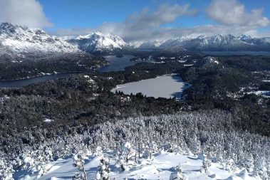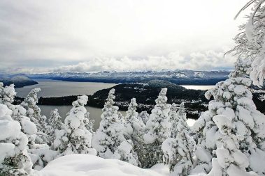 En invierno, las vistas desde el Cerro Campanario son deslumbrantes: paisajes nevados, montañas cubiertas de blanco, el Lago Nahuel Huapi reflejando el cielo y una tranquilidad absoluta, creando un entorno invernal único y sereno, ideal para disfrutar de la naturaleza patagónica.